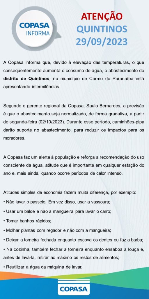 A Copasa informa que, devido ao período de estiagem e à elevação das temperaturas, o que consequentemente aumenta o consumo de água, o abastecimento na localidade de Quintinos, em Carmo do Paranaíba, está apresentando intermitências desde a tarde desta sexta-feira (29/09).