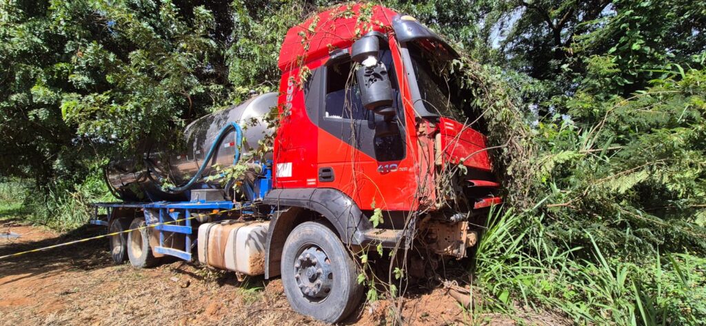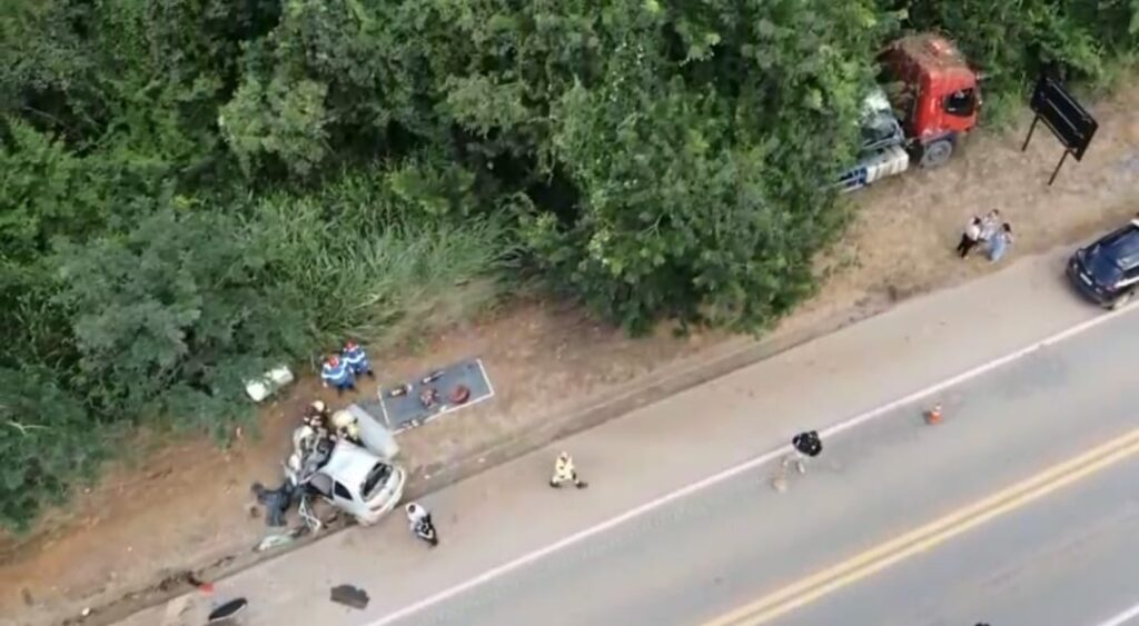 Em determinado momento, o caminhão invadiu a contramão e atingiu frontalmente o carro. Após o impacto, os dois veículos saíram da pista.