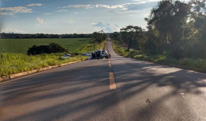 No local do acidente, os militares depararam com três veículos envolvidos na batida, sendo que dois estavam na faixa de domínio da via e um na posição transversal ocupando a faixa de transito.