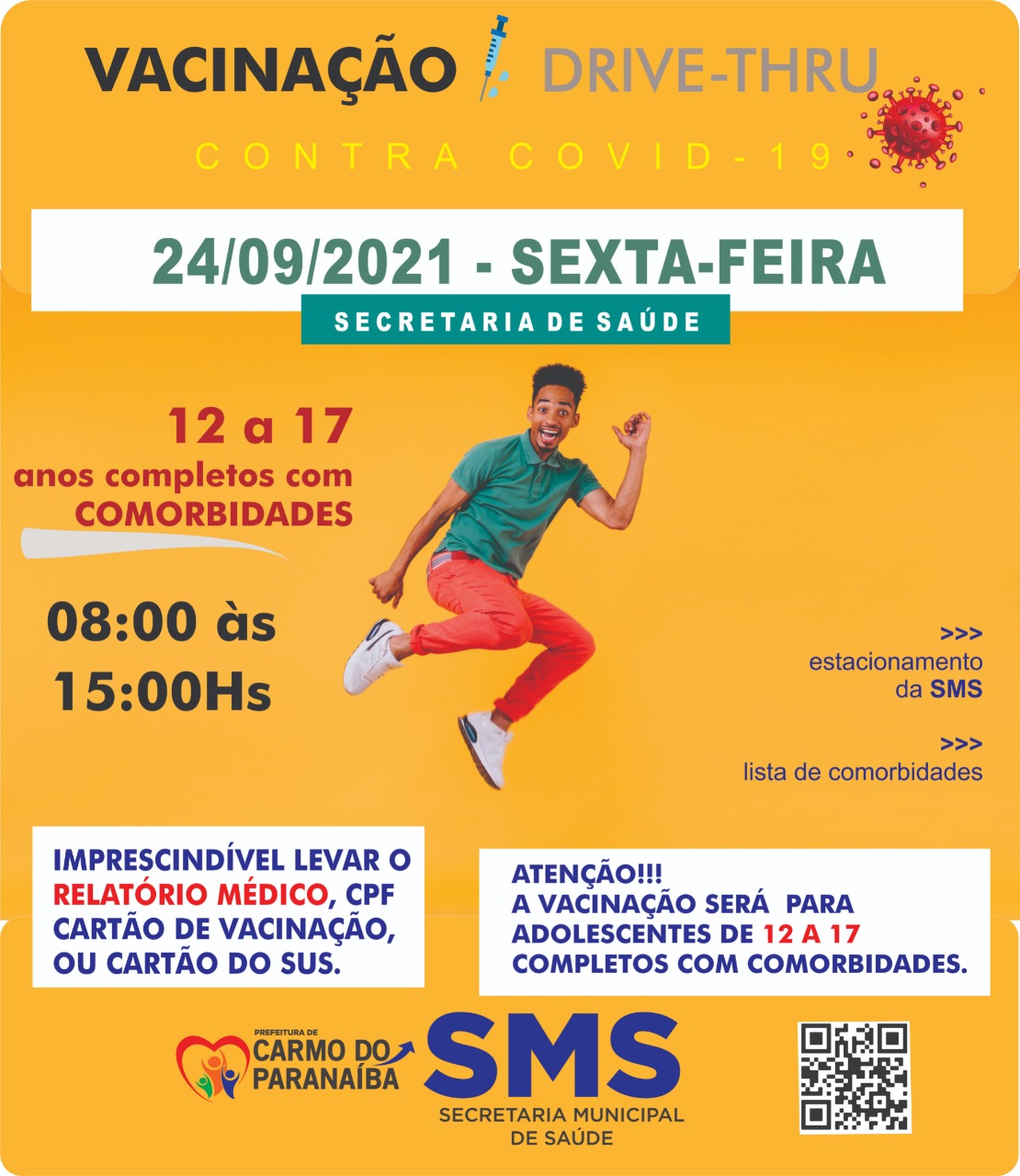 A Secretaria Municipal de Saúde (SMS) de Carmo do Paranaíba, realizará na próxima sexta-feira (24) a vacinação contra Covid-19 de adolescentes de 12 a 17 anos com comorbidade. A vacinação ocorrerá no formato Drive-Thru, no estacionamento da Secretaria de Saúde de 8:00h às 15:00h.