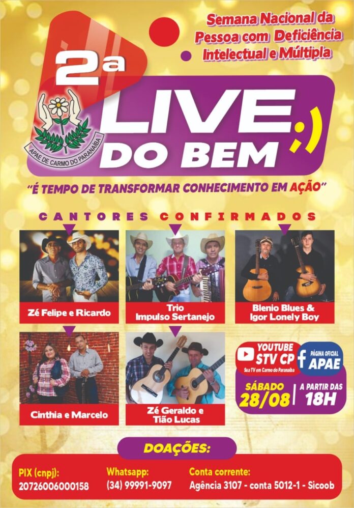 A Apae de Carmo do Paranaíba promove no próximo dia 28 de agosto (sábado) a 2ª Live do Bem, com o intuito de arrecadar fundos para a instituição.
