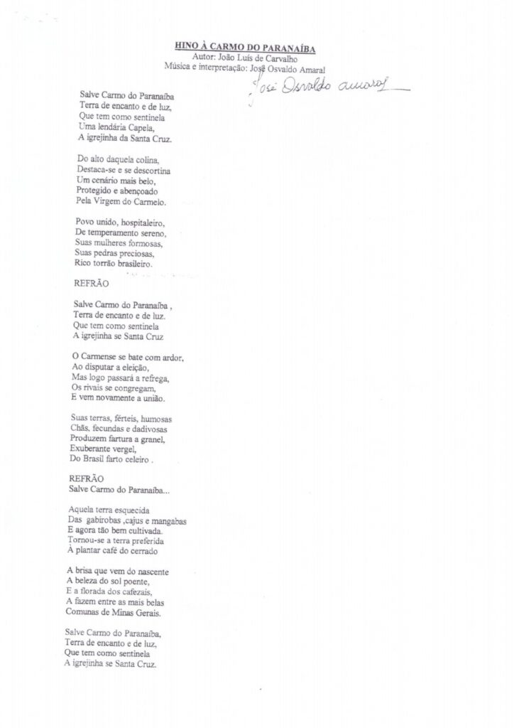 A letra, composta por João Luís de Carvalho fala sobre a Igrejinha da Santa Cruz, a hospitalidade do povo carmense, suas terras férteis e o café do cerrado.