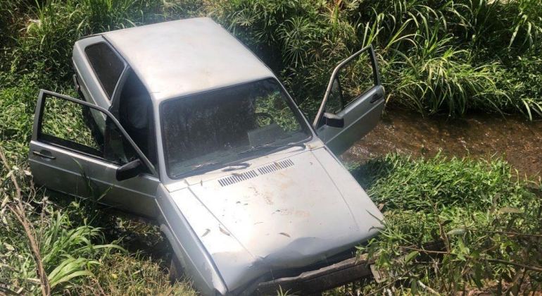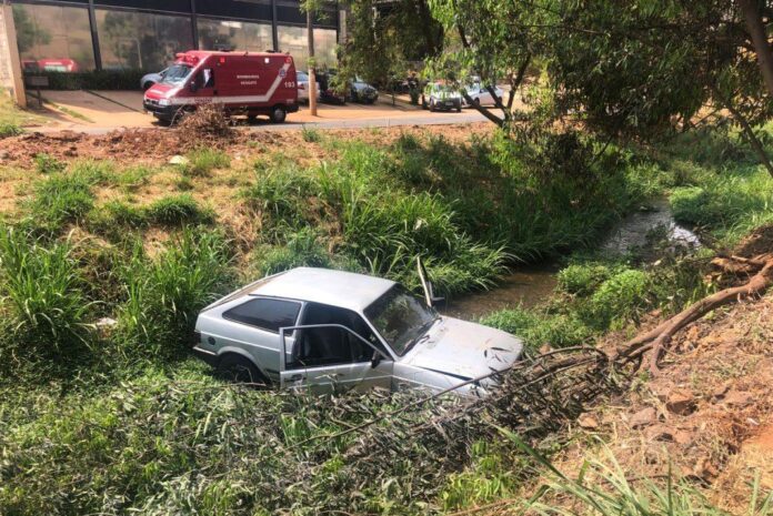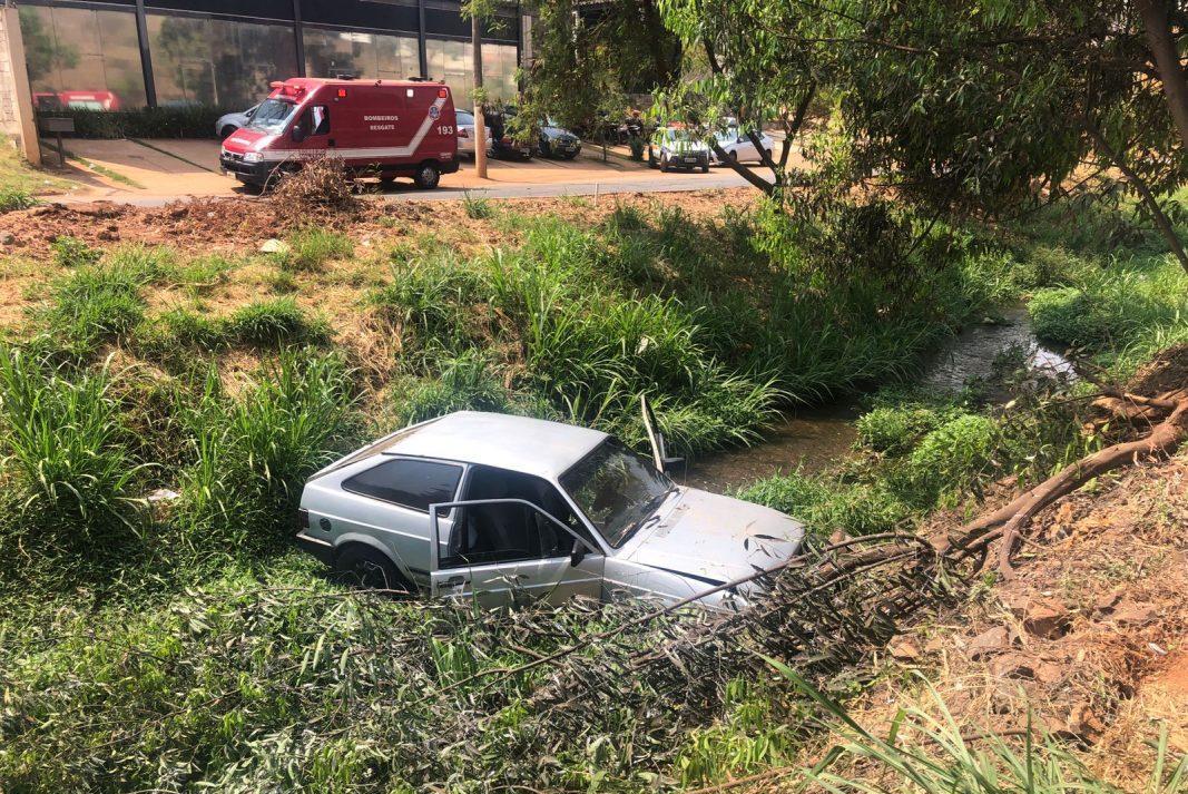 Um VW/Gol (modelo antigo) caiu dentro do Córrego do Monjolo na manhã desta quarta-feira (22), em Patos de Minas. O motorista de 43 anos trafegava na Av. Fátima Porto, rumo a Av. JK, quando perdeu o controle direcional do veículo, saiu da pista, bateu em uma árvore e caiu dentro do córrego.