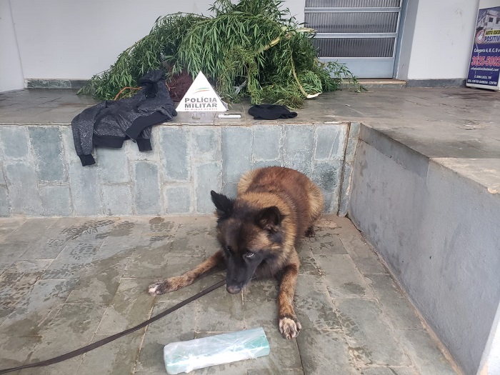 Os policiais foram até a casa da mulher e encontrou o veículo. Ao lado dele, havia um grande pé de maconha. A equipe de Rondas Ostensivas com Cães (ROCCA) foi acionada e o cão Kratus encontrou uma barra de maconha e uma balança de precisão.