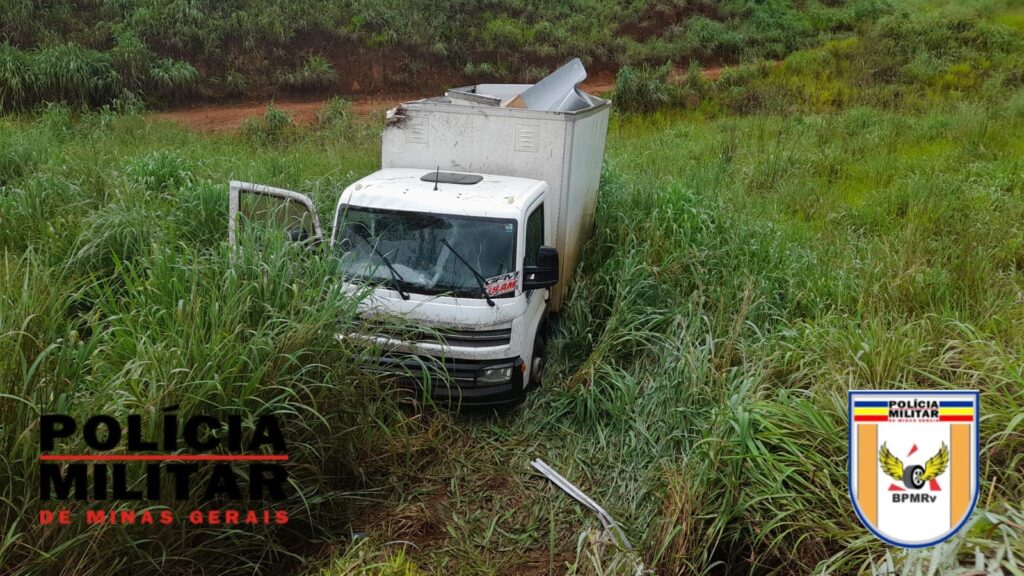 Uma caminhonete VW/Express, cor branca saiu da pista e permaneceu na vegetação da faixa de domínio.