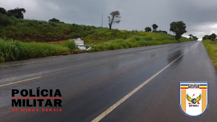 O condutor D.G.S., 37 anos, informou que deslocava no sentido Belo Horizonte para Patos de Minas. Durante uma chuva, ele perdeu o controle direcional do veículo automotor em virtude de aquaplanagem, nada podendo fazer para evitar a saída de pista.