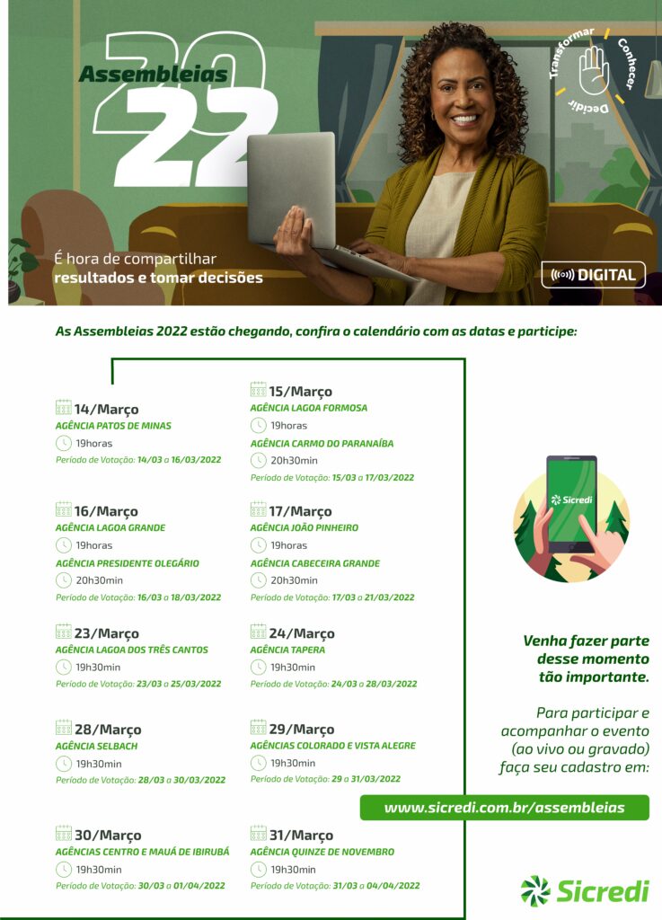 As Assembleias ao vivo acontecerão entre os dias 14 e 31 de março, com eventos ao vivo por agência. Caso o associado não consiga acompanhar no momento, a assembleia ficará gravada e disponível na plataforma para visualização até dois dias úteis após a sua realização. Os associados que acompanharem e votarem na sua assembleia receberão brindes pela sua participação. Confira o cronograma das assembleias ao vivo: