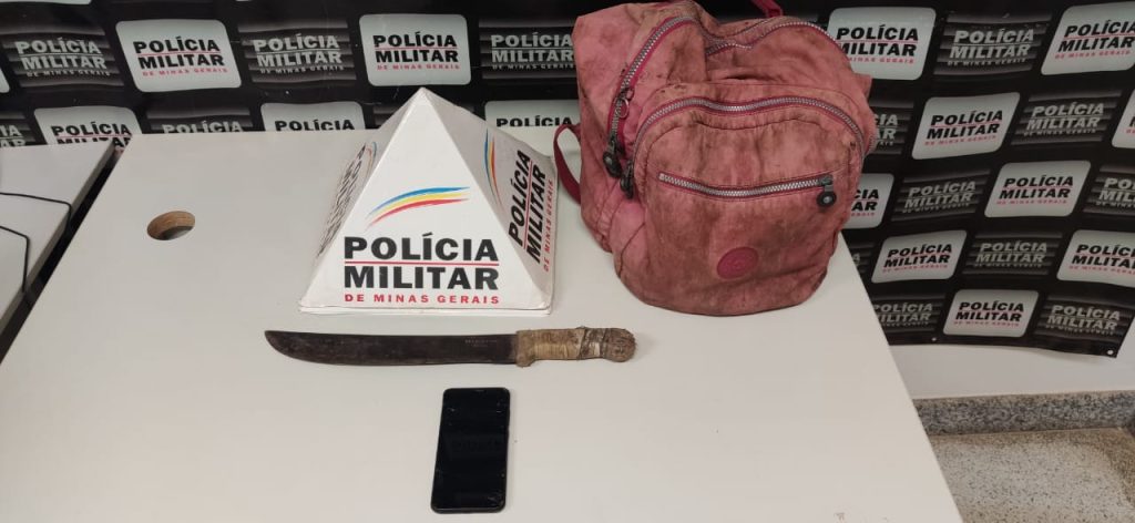 No momento da abordagem, o homem abordava veículos portando o facão utilizado na ação criminosa e uma pedra nas mãos, mas não resistiu à voz de prisão, sendo contido e algemado.