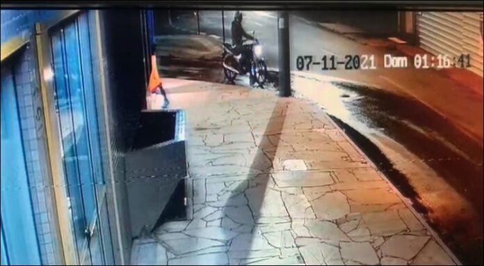 De acordo com informações, a Polícia Militar foi acionada pelo sistema de monitoramento da loja. Chegando no local, os militares se depararam com a loja arromabda. As imagens de segurança mostram dois bandidos em uma motocicleta. O “garupa” desce e quebra a porta de vidro da loja utilizando uma marreta.