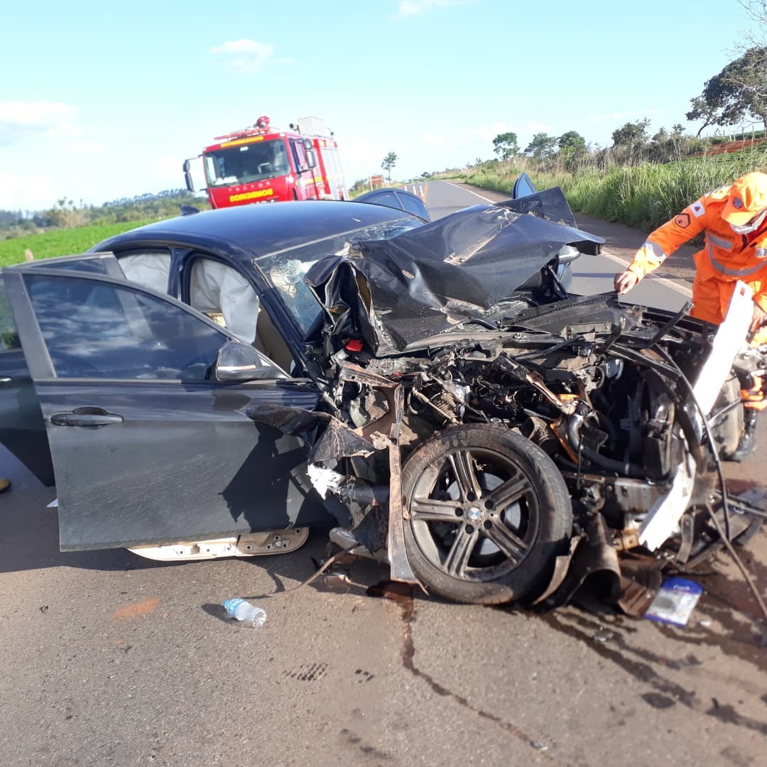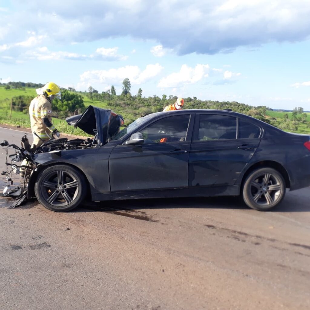 Segundo informações do Corpo de Bombeiros, a batida envolveu um carro da marca BMW e uma carreta.