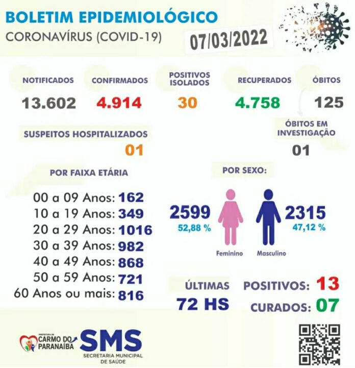 Boletim Epidemiológico – 13 casos de Covid-19 confirmados nas últimas 72 horas em Carmo do Paranaíba; sete pessoas saíram do isolamento