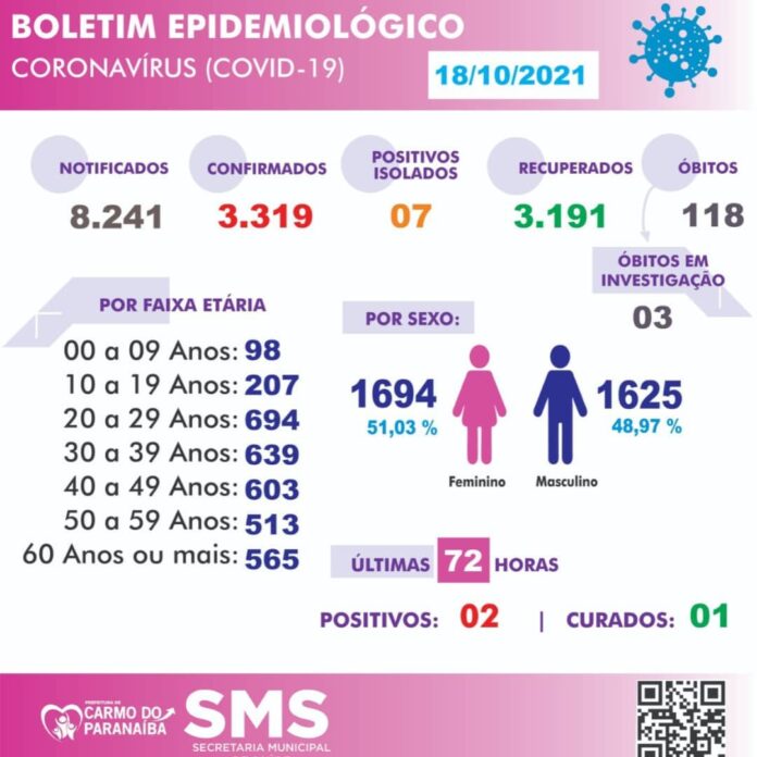 São 8.241 o número de casos notificados, 3.319 positivados e 3.191 curados.