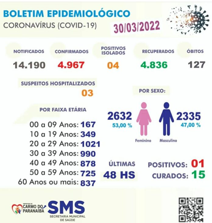 Nas últimas 48 horas, apenas um caso de Covid-19 foi confirmado e 15 pessoas saíram do isolamento em Carmo do Paranaíba.