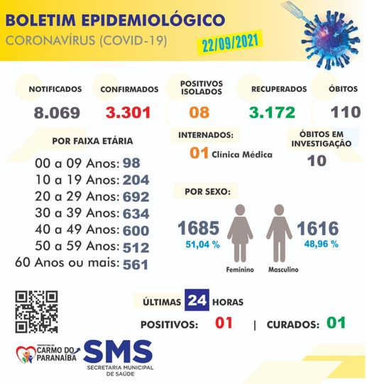 Ao todo 8.069 casos notificados, destes, 3.301 positivados com 3.172 curados.
