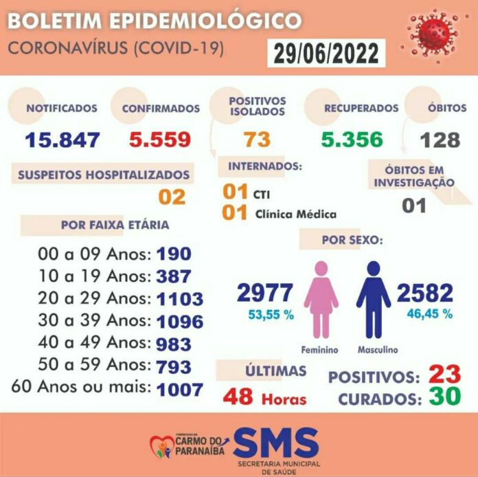 De acordo com o Boletim Epidemiológico desta quarta-feira (29), são 73 casos positivos isolados, um internado em clínica médica, um em CTI e dois suspeitos hospitalizados.