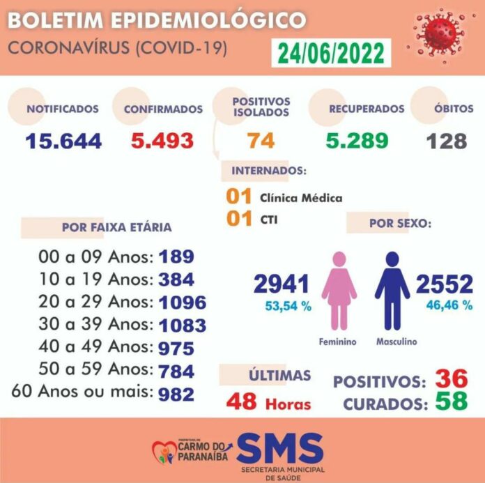 De acordo com o Boletim Epidemiológico desta sexta-feira (24), são 74 casos positivos isolados, um internado em clínica médica e um em CTI.