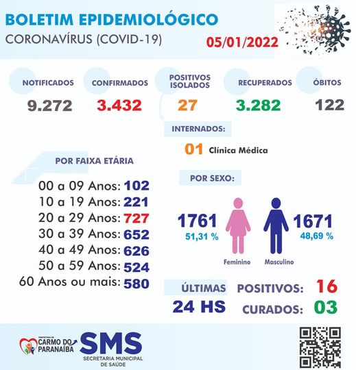 De acordo com o Boletim Epidemiológico desta quarta-feira (05), o município possui 27 positivos isolados e um em clínica médica.