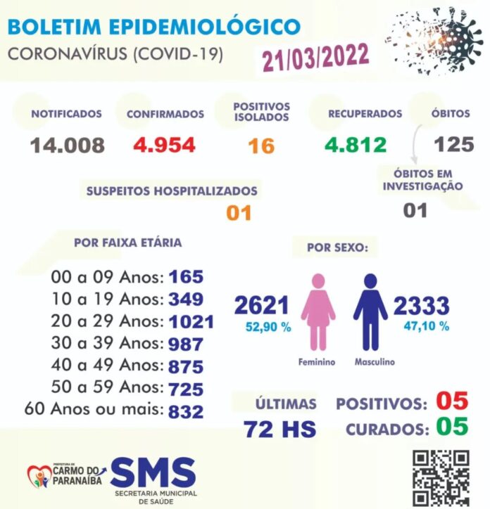 Nas últimas 72 horas, cinco casos de Covid-19 foram confirmados e cinco pessoas saíram do isolamento em Carmo do Paranaíba.