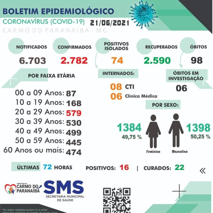 Boletim Epidemiológico divulgado nesta segunda-feira (21), confirma 16 novos casos, 22 curados e 2 óbitos nas últimas 72 horas em Carmo do Paranaíba