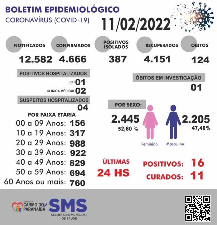 Nas últimas 24 horas foram 16 casos de Covid-19 confirmados em Carmo do Paranaíba e 11 saíram do isolamento.
