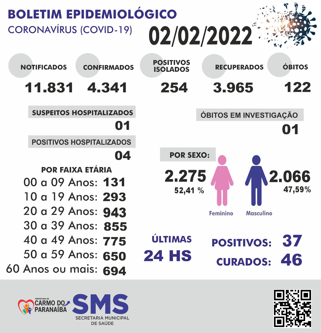 De acordo com o Boletim Epidemiológico desta quarta-feira (02), o município possui 254 positivos isolados e um suspeito hospitalizado e quatro positivos hospitalizados.