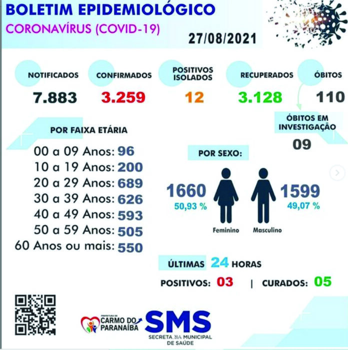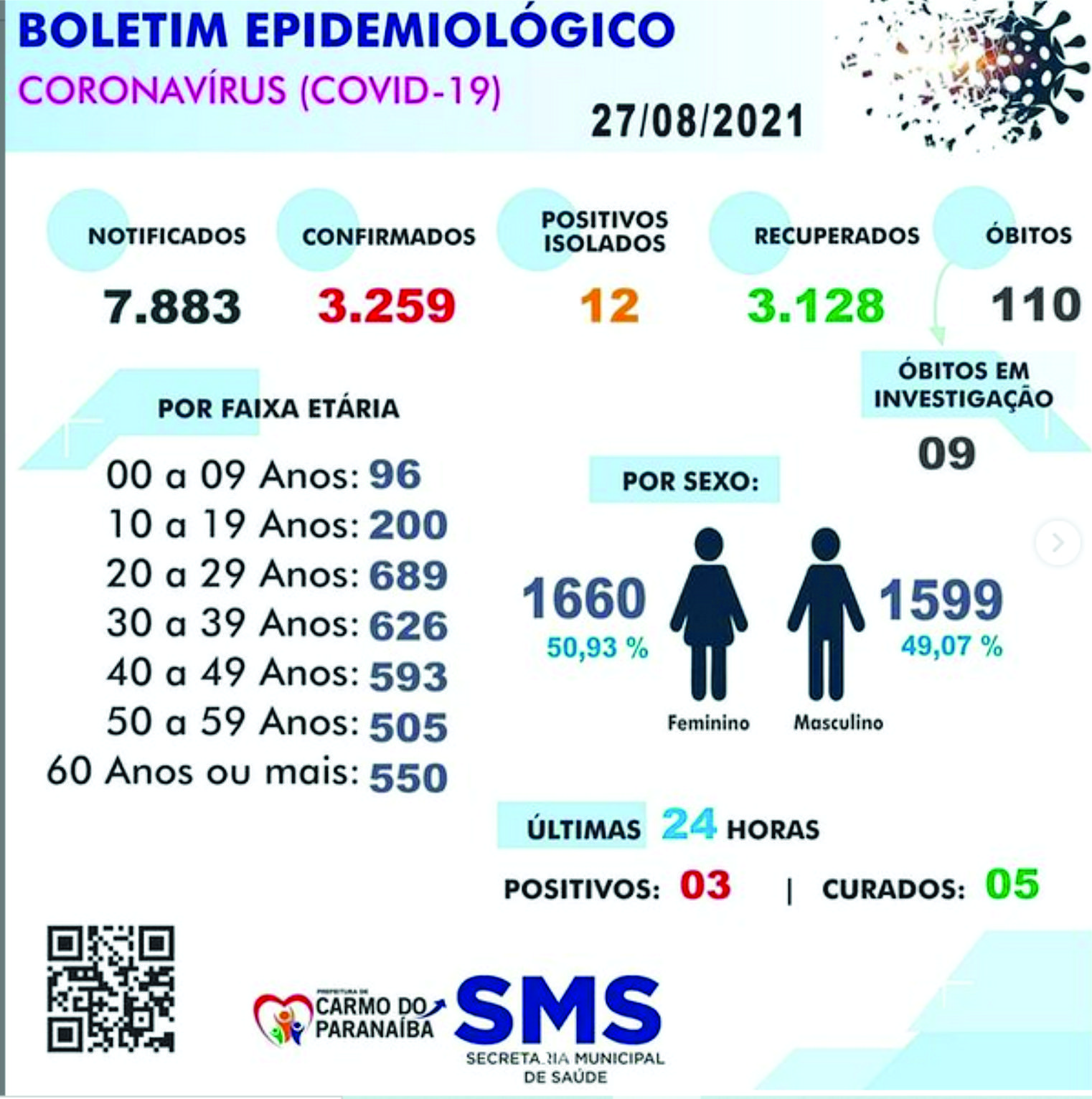 Ao todo 7.883 casos notificados, destes, 3.259 positivados com 3.128 curados. Já são 110 óbitos confirmados e nove em investigação.