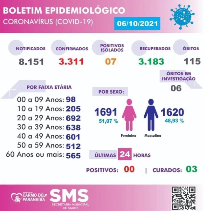 Boletim Epidemiológico: Nenhum caso confirmado e três curados nas últimas 24 horas em Carmo do Paranaíba