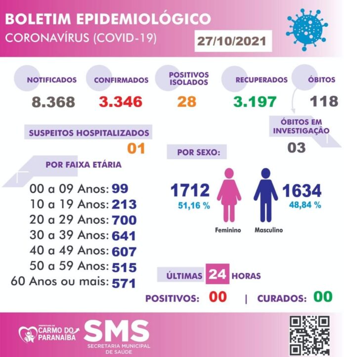 São 8.368 o número de casos notificados, 3.346 positivados e 3.197 curados.