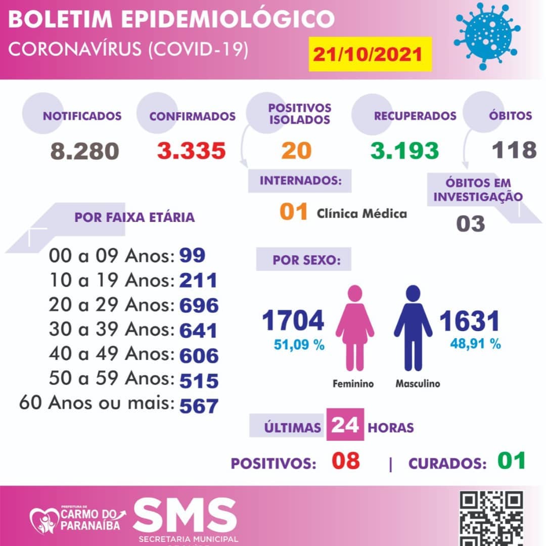 São 8.280 o número de casos notificados, 3.335 positivados e 3.193 curados.