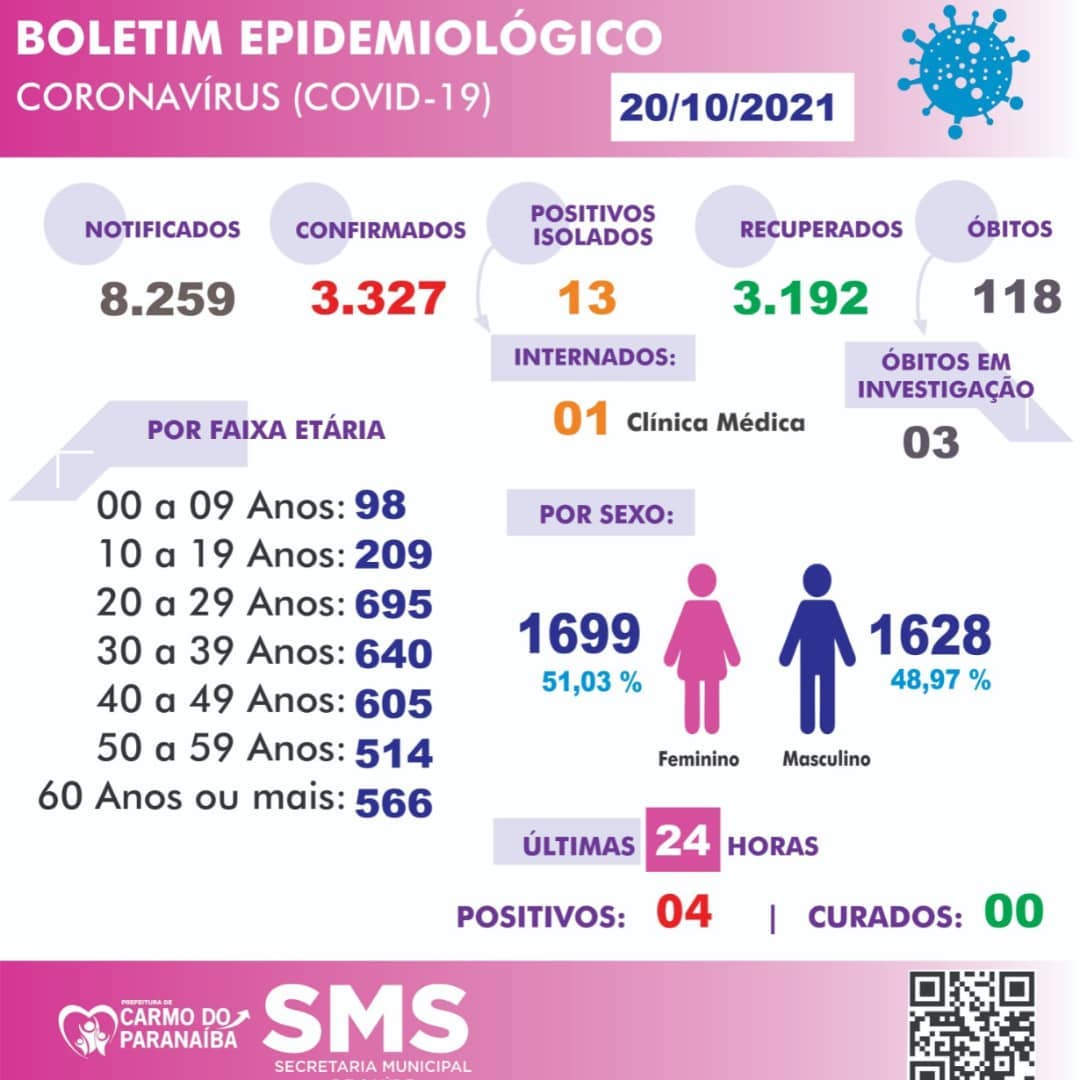 Boletim Epidemiológico: Quatro casos de Covid-19 foram confirmados nas últimas 24 horas em Carmo do Paranaíba