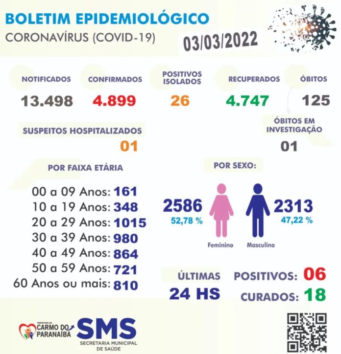 Nas últimas 24 horas, seis casos de Covid-19 foram confirmados e 18 saíram do isolamento em Carmo do Paranaíba.