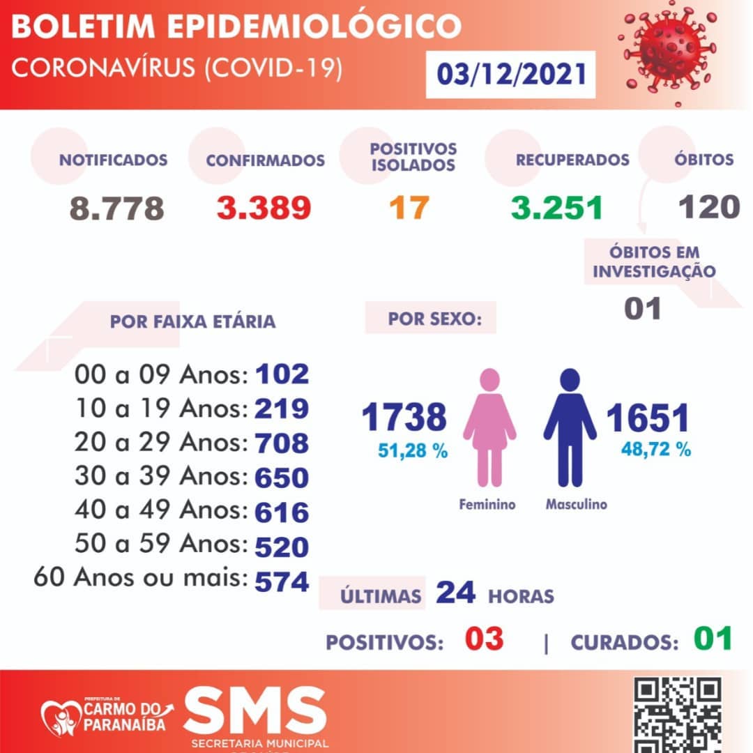 Nas últimas 24 horas três casos de Covid-19 foram confirmados em Carmo do Paranaíba e uma pessoa foi curada.