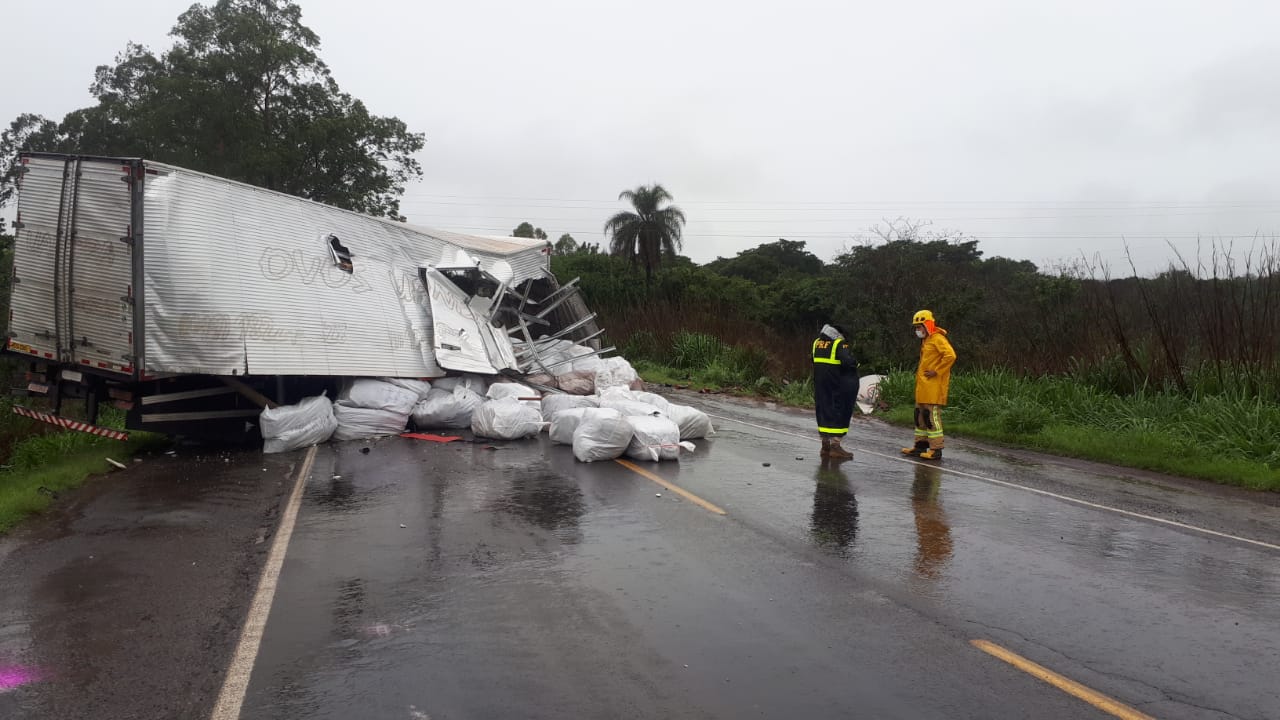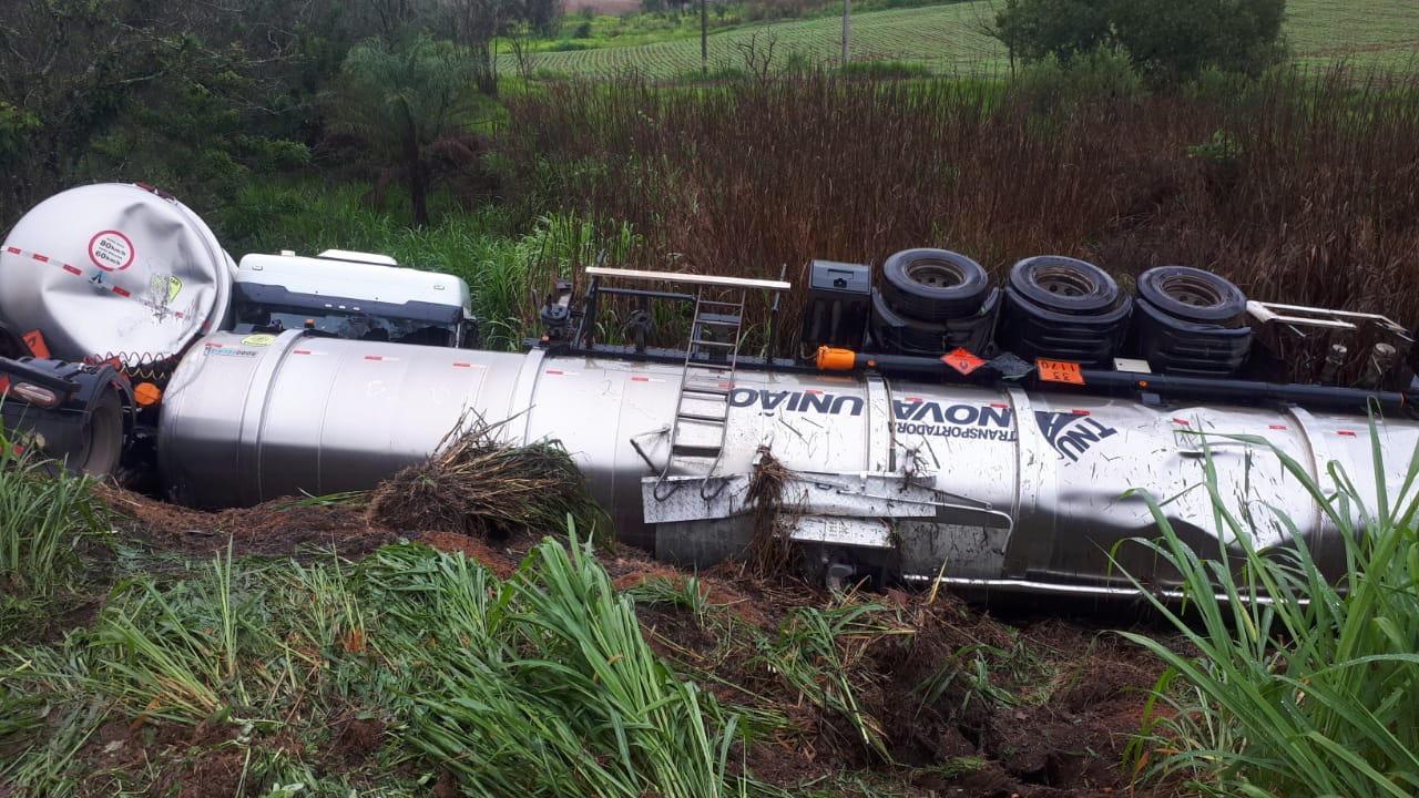 Na manhã desta quinta-feira(11), uma carreta bitrem carregada com 60 mil litros de etanol tombou no km 717 da BR 262, município de Araxá. O tombamento se deu após uma colisão frontal com um caminhão baú, que carregava calçados.