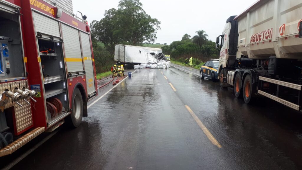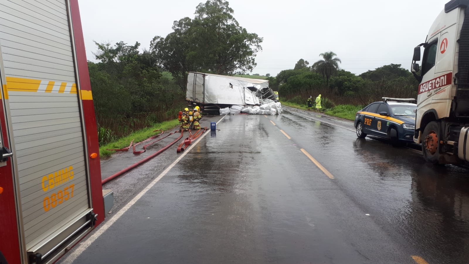 As equipes do Corpo de Bombeiro trabalham na prevenção até a chegada da empresa responsável por fazer o transbordo da carga.