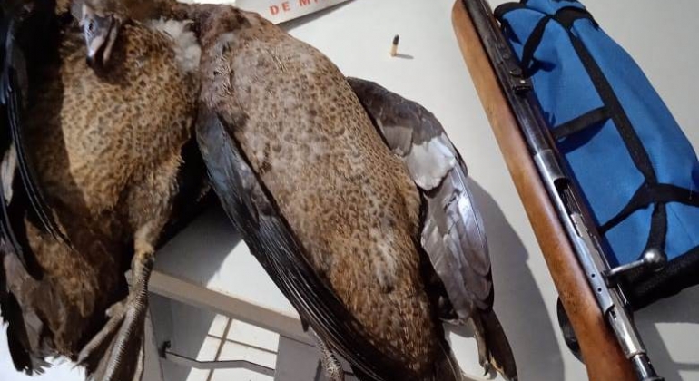 Imediatamente, os militares deslocaram para a fazenda e depararam com os dois suspeitos. Próximo ao homem de 43 anos, os militares encontraram um rifle calibre 22 e sob a vegetação dois patos selvagens abatidos.