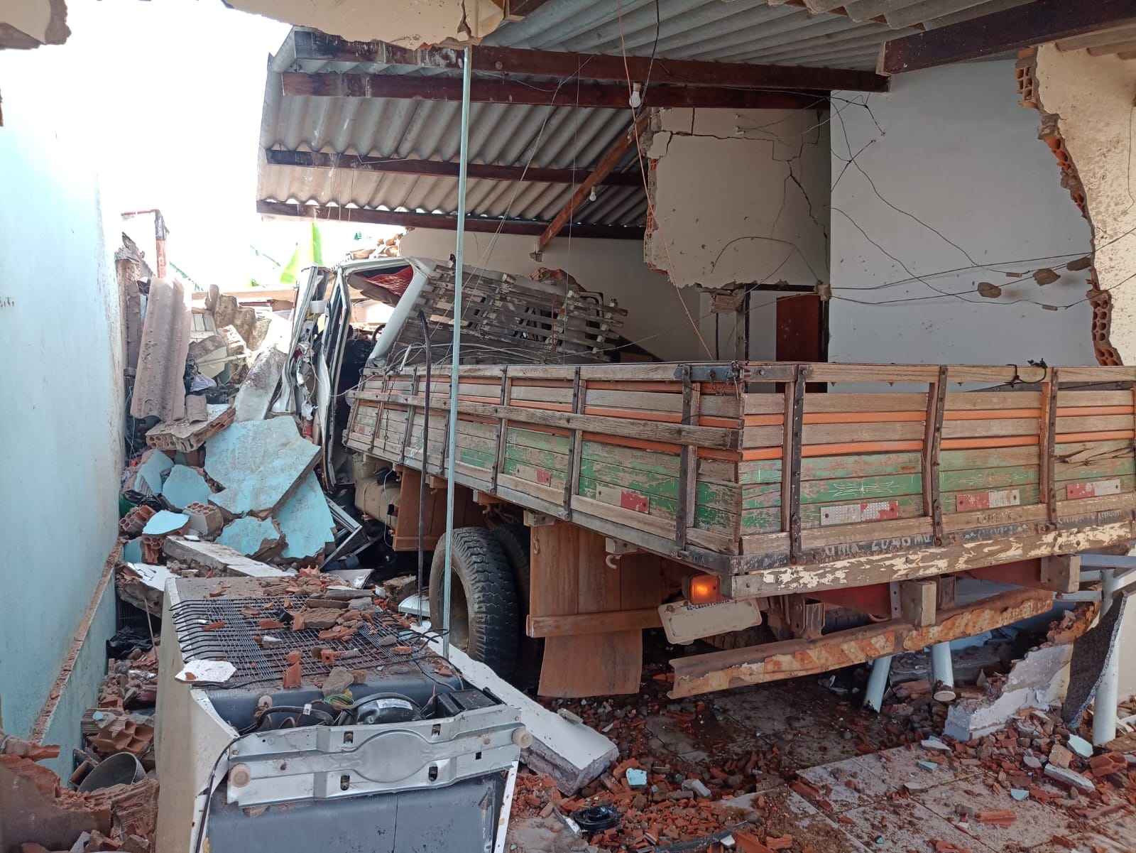 No fim da Rua, o caminhão atravessou a Avenida João Baptista Rodrigues, passou por uma residência e atingiu os fundos de outra casa. Um morador que dormia neste segundo imóvel foi atingido pelos escombros.