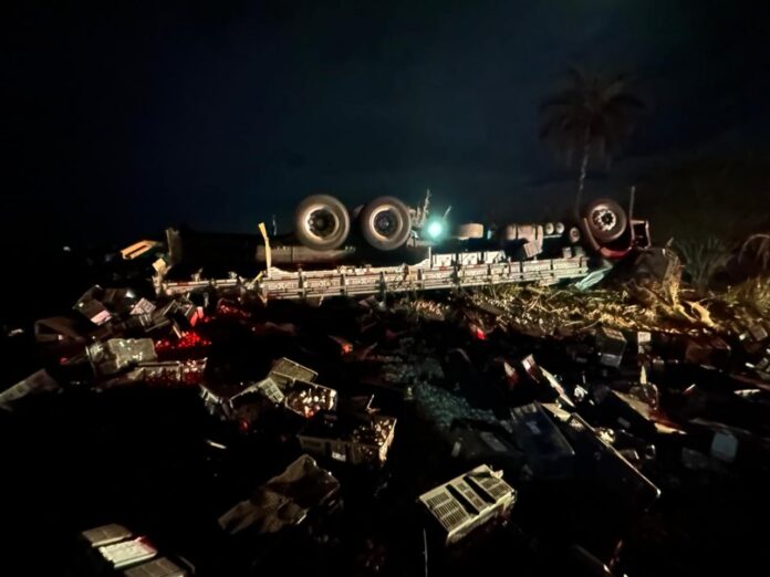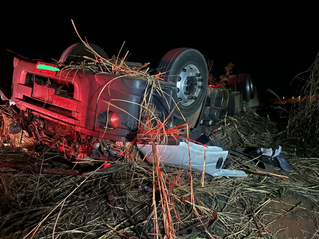 Segundo testemunhas, o caminhão foi encontrado capotado sobre a faixa de domínio da rodovia, com a carga espalhada pela pista, interditando o sentido crescente da via. O motorista, de 29 anos, ficou preso às ferragens, sem sinais vitais. O Corpo de Bombeiros Militar realizou o desencarceramento.