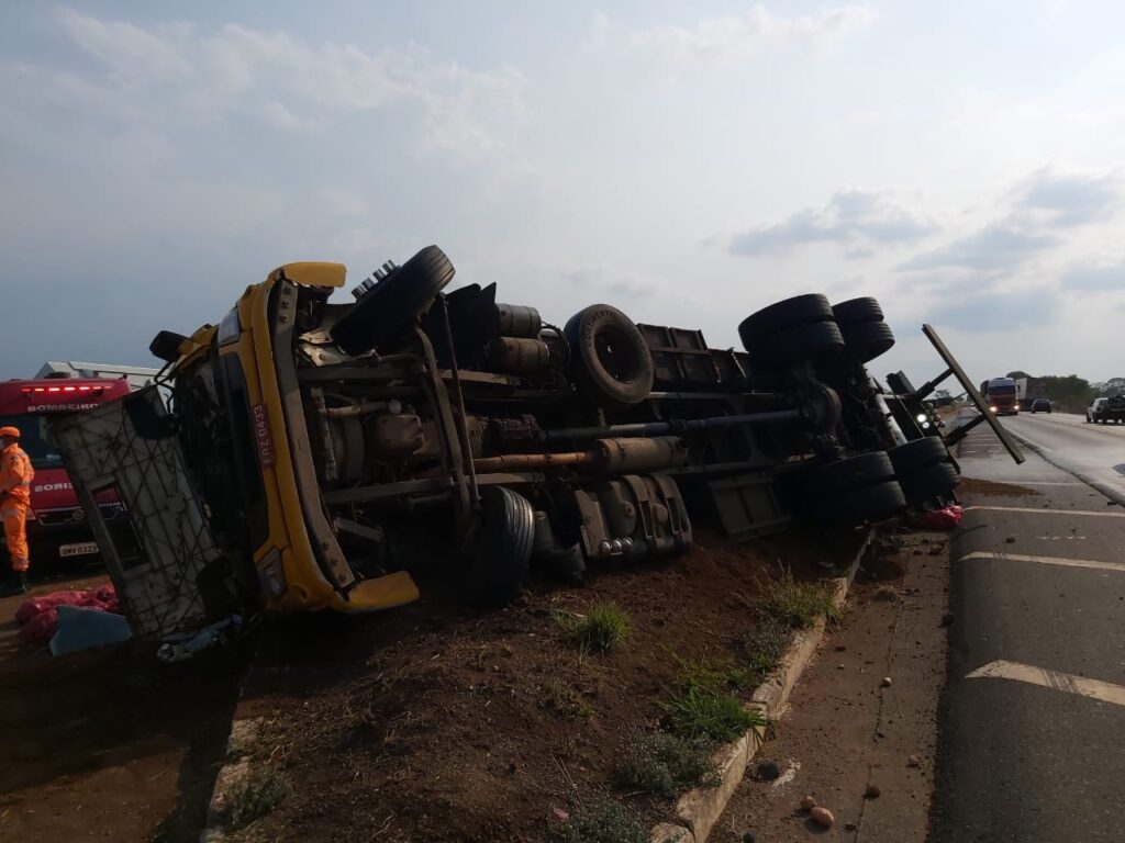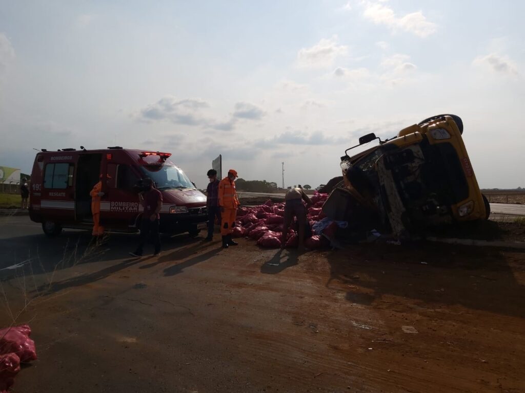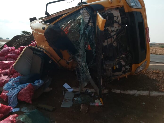 Na tarde de hoje (26), um motorista de 32 anos que dirigia um caminhão carregado com batatas, perdeu o controle direcional do veículo e capotou na BR 365, trevo de acesso a Santana de Patos.