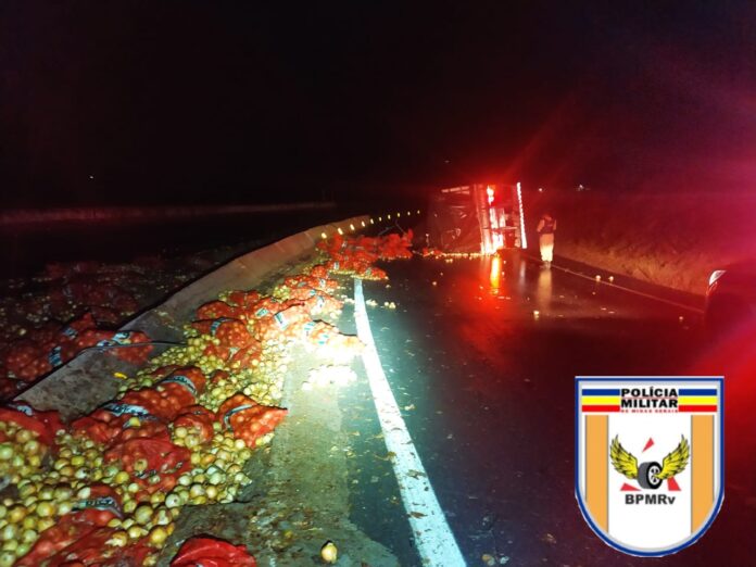 O veículo tombou e obstruiu por completo a via. Já a carga de cebolas ficou espalhada na pista após o acidente.