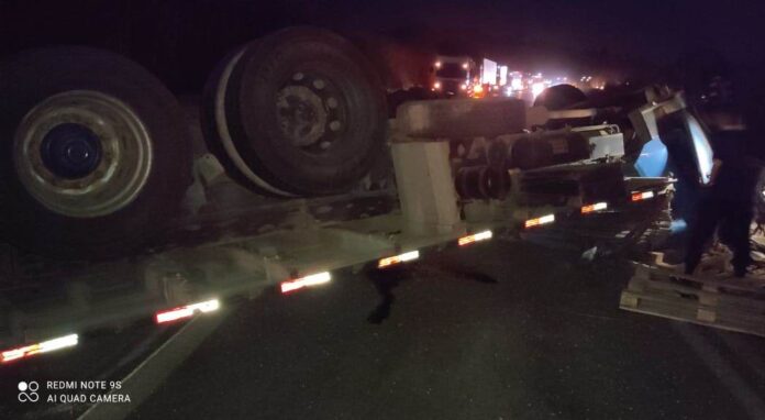 Um motorista ficou ferido após tombar um caminhão carregado com feijão. O acidente aconteceu na noite desta quinta-feira (10/08) no KM 361, da BR-365, entre Patos de Minas e Varjão de Minas.
