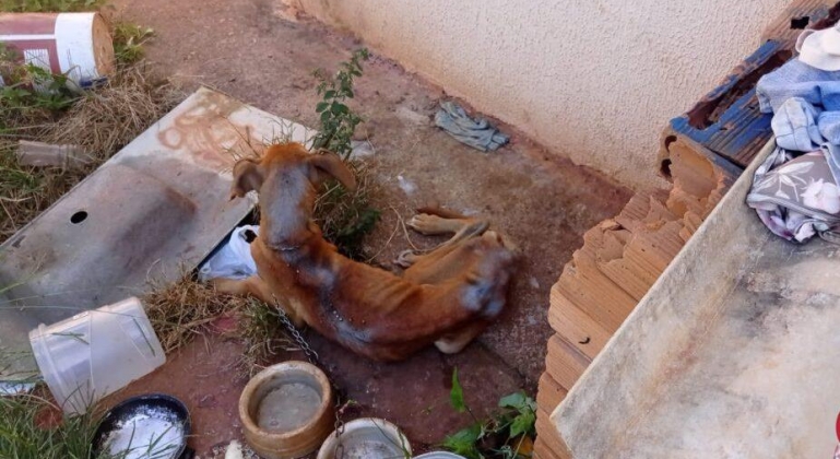 O cão de cor amarela e raça indefinida apresentava estar bastante debilitado, com feridas pelo corpo, bicheiras, excesso de carrapatos, desidratado e desnutrido. Além disso, não havia água ou comida no local. O cachorro estava preso com uma corrente numa casinha improvisada, em meio a diversos objetos de descarte espalhados pelo quintal.