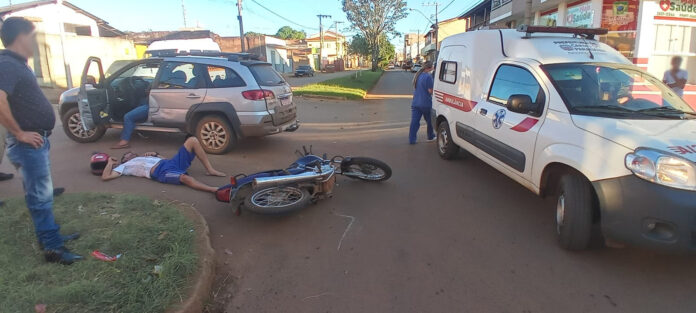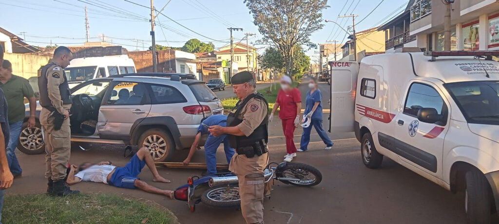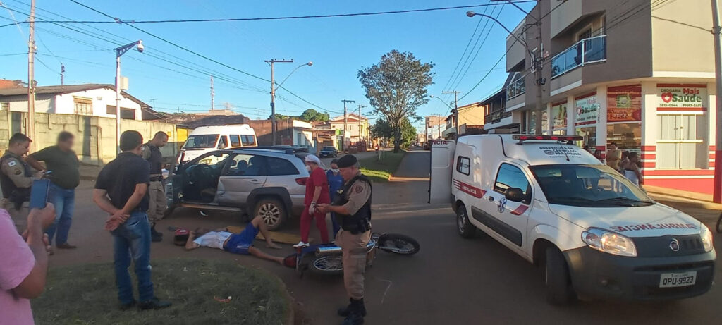 Na tarde deste domingo (03), um acidente entre um carro e uma moto deixou um homem ferido. O acidente aconteceu na esquina da Avenida Tancredo Neves com a Rua Frei Santi de Alia, no bairro Alvorada, em Carmo do Paranaíba.