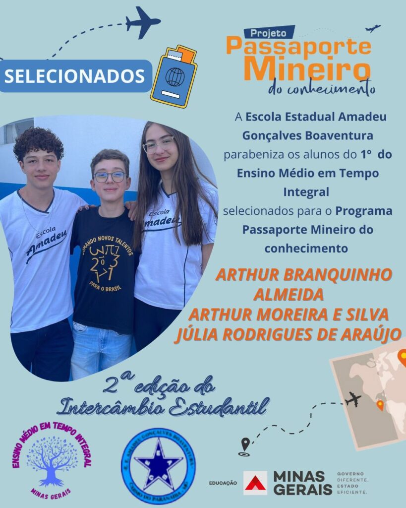 A Escola Estadual Amadeu Gonçalves Boaventura, de Carmo do Paranaíba, está em festa. Os estudantes Júlia Rodrigues, Arthur Branquinho e Arthur Moreira foram aprovados na segunda fase do Passaporte Mineiro do Conhecimento, programa do Governo de Minas que leva alunos da rede pública a um intercâmbio internacional.