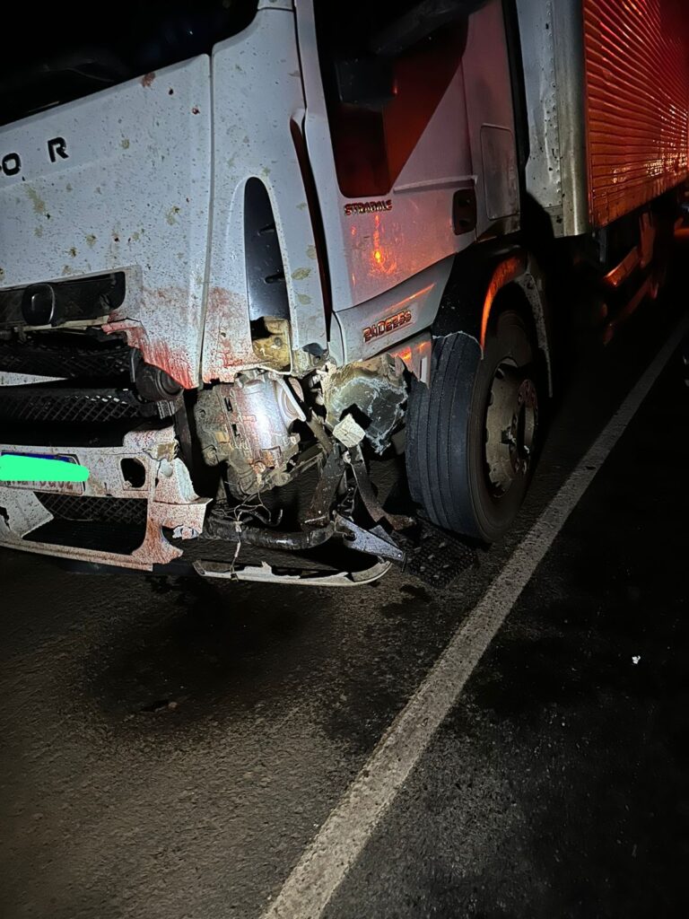 O outro caminhão que vinha logo em seguida do primeiro também não conseguiu evitar a colisão contra o animal, mas não teve muitos danos.