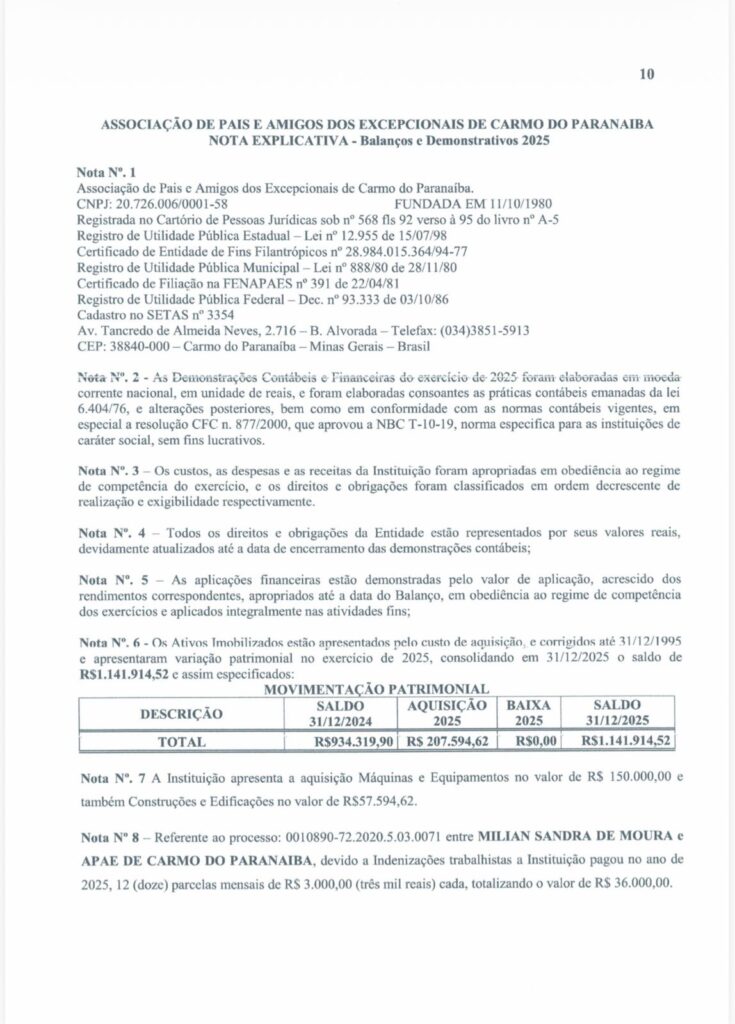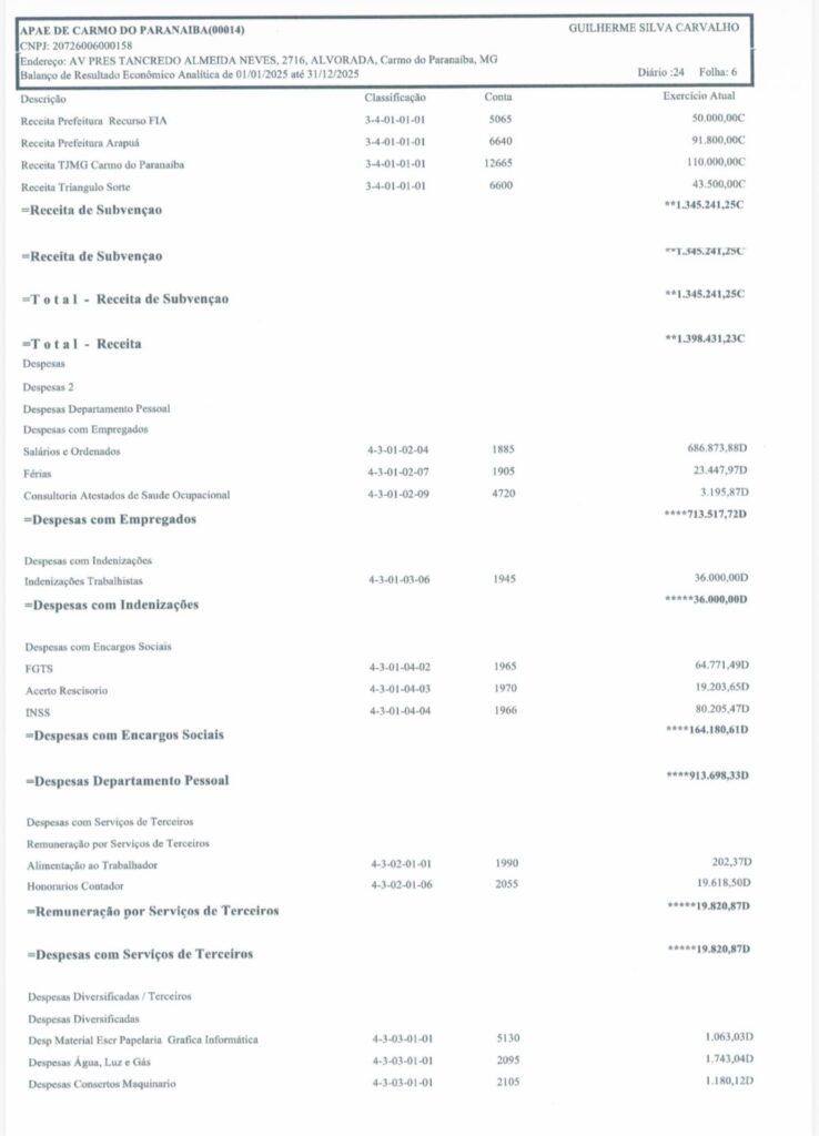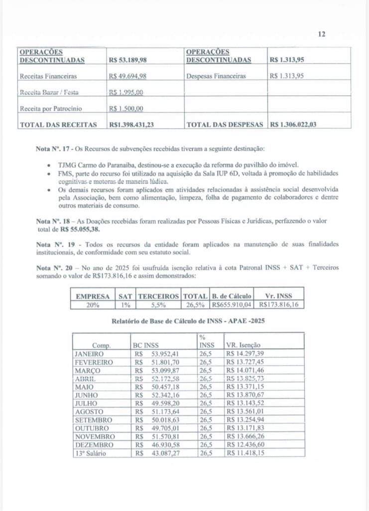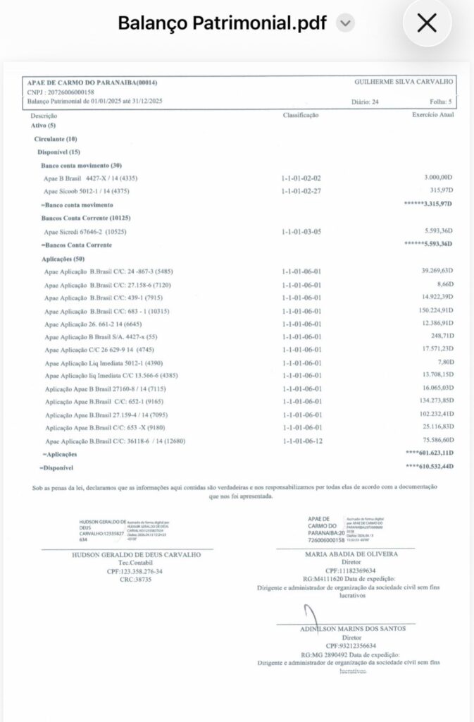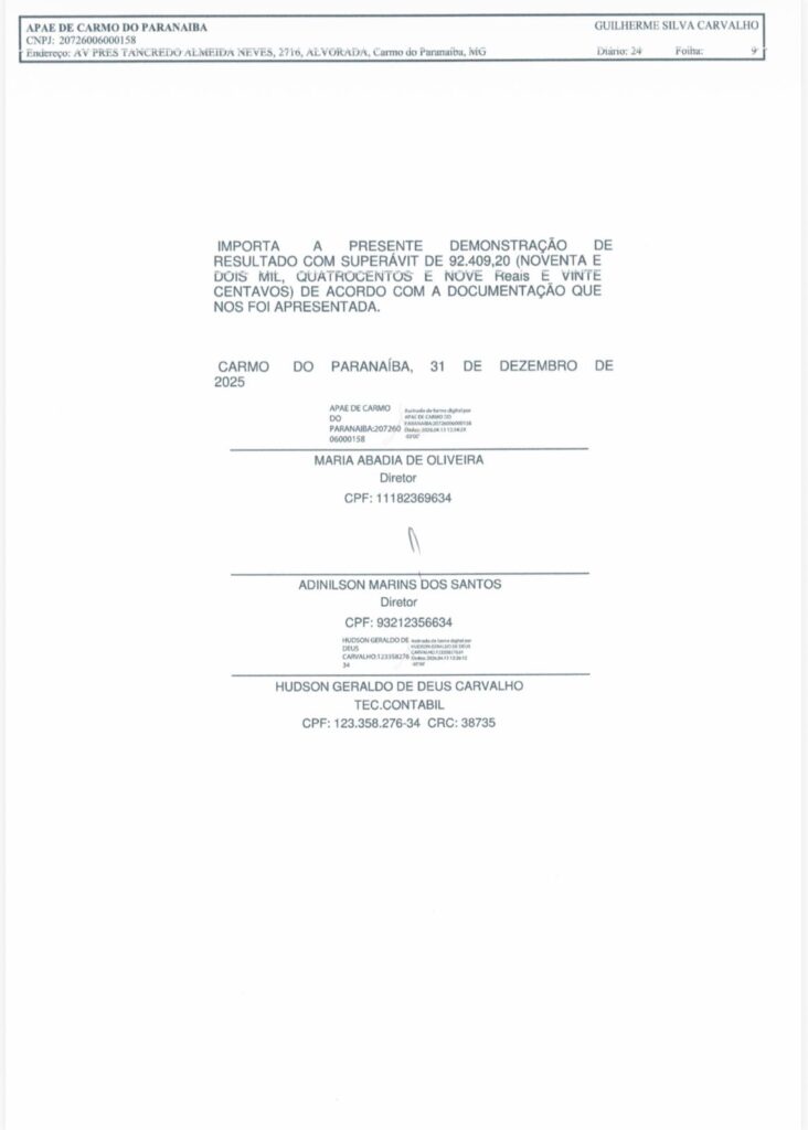 Carmo do Paranaíba – APAE divulga Demonstrativos Contábeis 2025 By Tribuna Informa abril 30, 2026 A APAE de Carmo do Paranaíba divulgou na manhã de hoje (30/04), os demonstrativos contábeis da instituição relativos ao exercício de 2025. Confira: Share FacebookTwitterPinterestWhatsApp Previous articleProcura por homem desaparecido mobiliza autoridades e população em Patos de MinasNext articleCarmo do Paranaíba – Mulher é detida após agressão durante discussão com companheiro RELACIONADAS Cidade Procura por homem desaparecido mobiliza autoridades e população em Patos de Minas abril 29, 2026 Cidade Deputado Hely Tarquínio visita Santa Casa de Carmo do Paranaíba e acompanha aplicação de recursos abril 28, 2026 Cidade Carmo do Paranaíba – Facilite seu voto e transfira o título para uma seção com acessibilidade abril 28, 2026 LEAVE A REPLY Cancel reply Comment: Please enter your comment! Name:* Please enter your name here Email:* You have entered an incorrect email address! Please enter your email address here Website: Save my name, email, and website in this browser for the next time I comment. Mais Acessados Carmo do Paranaíba – Mulher é detida após agressão durante discussão com companheiro abril 30, 2026 Procura por homem desaparecido mobiliza autoridades e população em Patos de Minas abril 29, 2026 Criminoso furta bateria e parafusadeira de carro em Carmo do Paranaíba abril 29, 2026 Caminhão de empresa de laticínios de Lagoa Formosa incendeia em estrada da zona rural do município abril 29, 2026