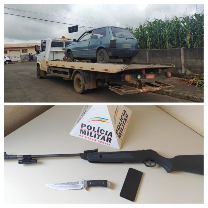 Durante a abordagem, um veículo Fiat/Uno, que estava perto dos suspeitos se encontrava com os vidros abertos e um deles tentou esconder um celular no interior do veículo apesar de alegar que não sabia quem era o dono do automóvel.