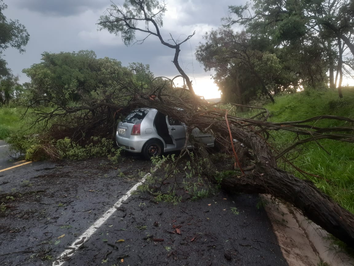 Uma chuva com vendaval na tarde deste sábado (18/11) provocou a queda de uma árvore sobre um carro com cinco ocupantes. O fato ocorreu por volta das 15h40, no trecho que fica próximo à entrada para a comunidade de Campo do Meio. O motorista do veículo, um homem de 67 anos, ficou ferido e foi levado por uma ambulância do SAMU para receber atendimento na Unidade de Pronto Atendimento (UPA) da cidade.