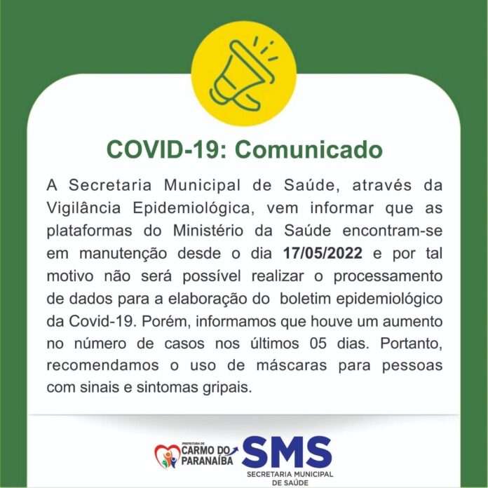 A Secretaria de Saúde de Carmo do Paranaíba não publicou o Boletim Epidemiológico nos últimos dias, mas emitiu uma nota ontem (18) pedindo a população que se encontra com suspeita da doença ou com sintomas gripais que continuem usando máscara e mantendo o distanciamento.