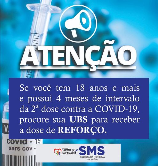 A Secretaria Municipal de Saúde informa: se você tem 18 anos e mais e possui 4 meses de intervalo da segunda dose contra a COVID-19, procure seu PSF para receber a dose de REFORÇO.