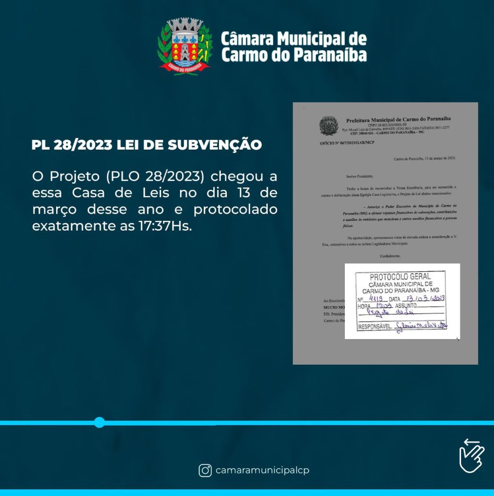 O projeto chegou à Câmara Municipal de Carmo do Paranaíba no dia 13 de março desse ano e protocolado exatamente as 17h37.